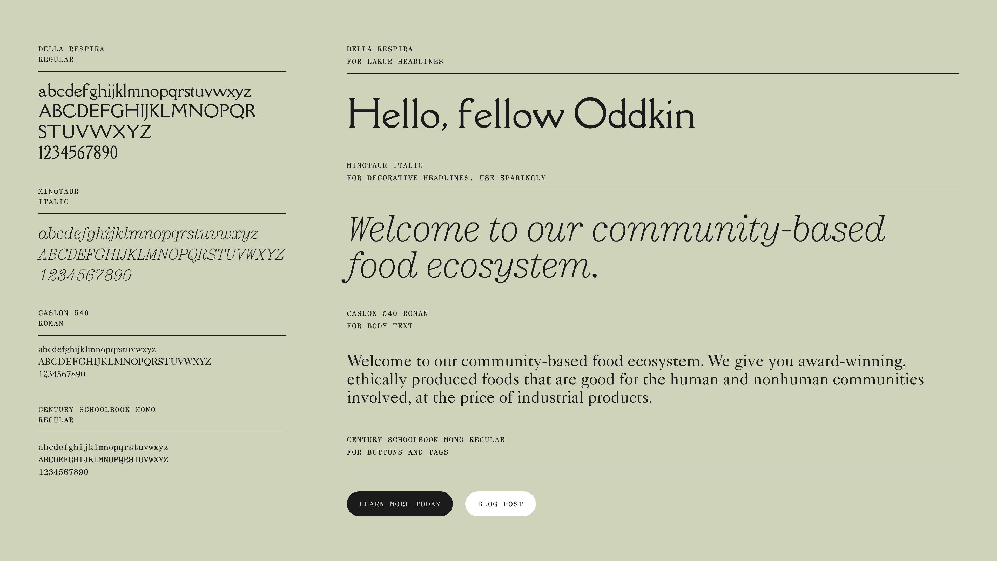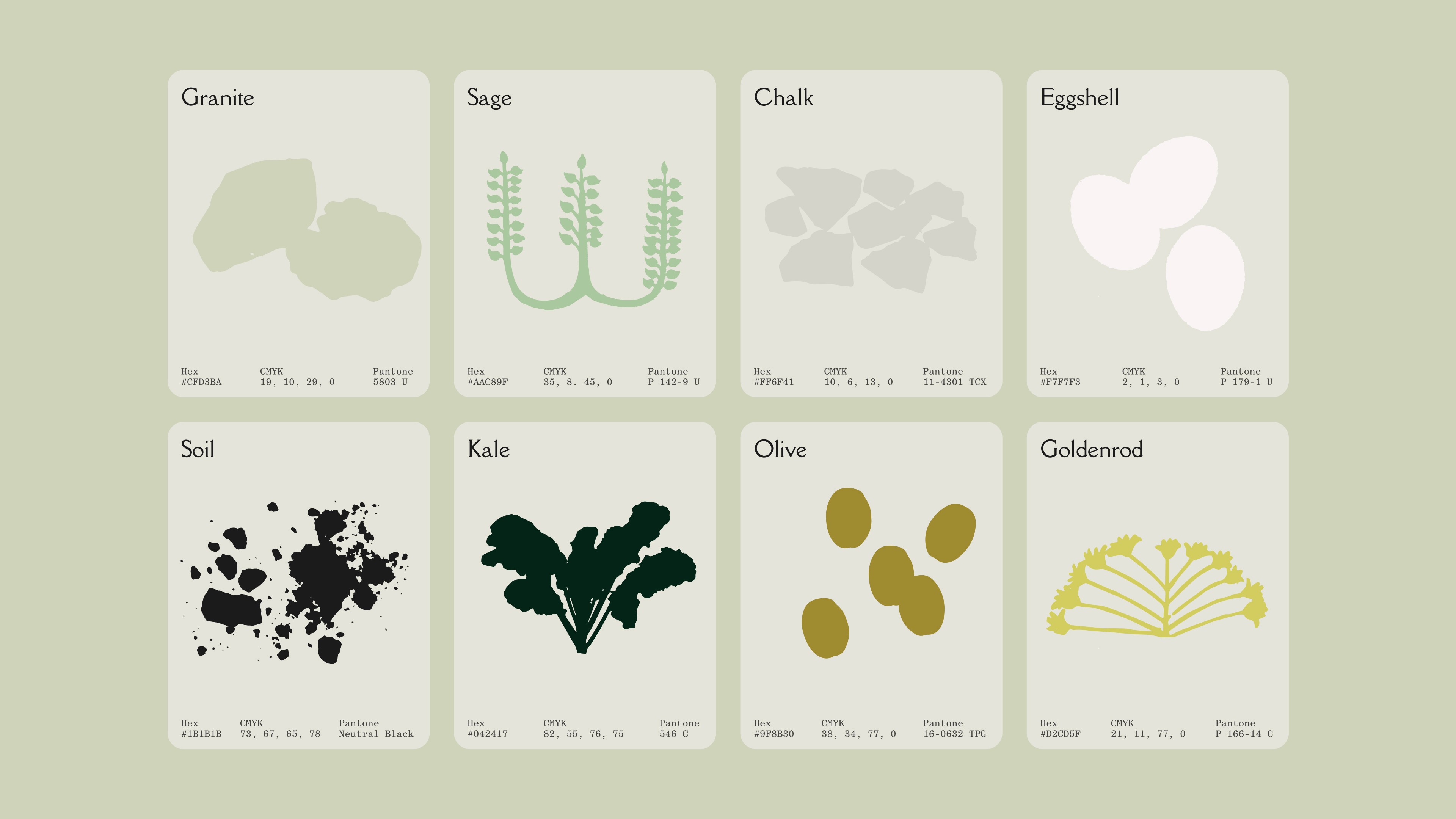 For our palette, we relied on natural tones, and extended this to our photography and brand materials. Our fonts are a combination of open-source and commercially licensed, with each feeling a bit "odd" with the quirkiness of their letterforms.