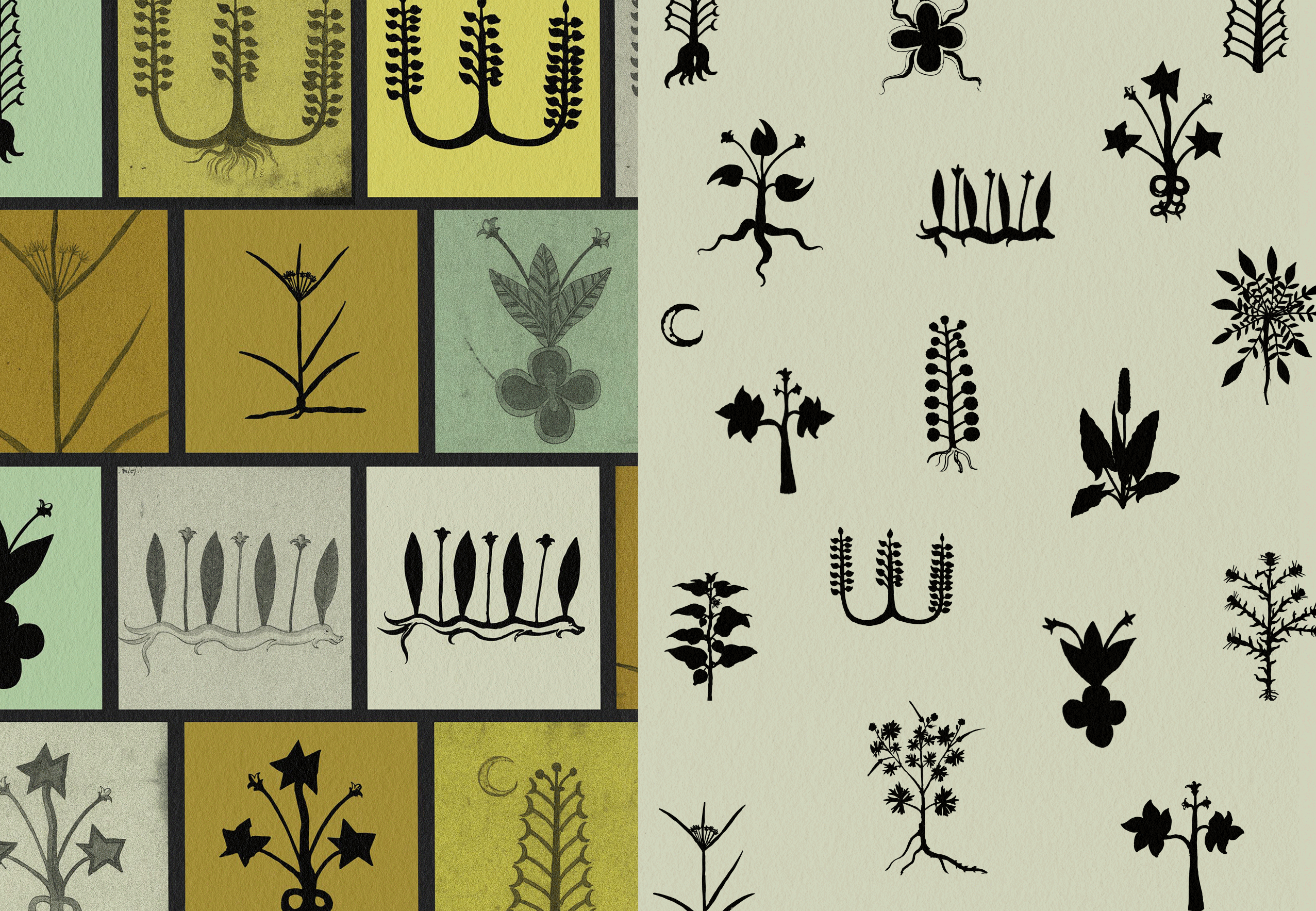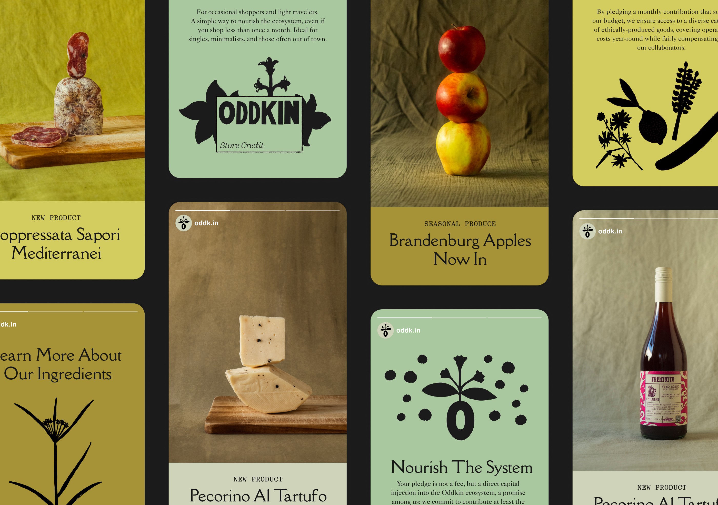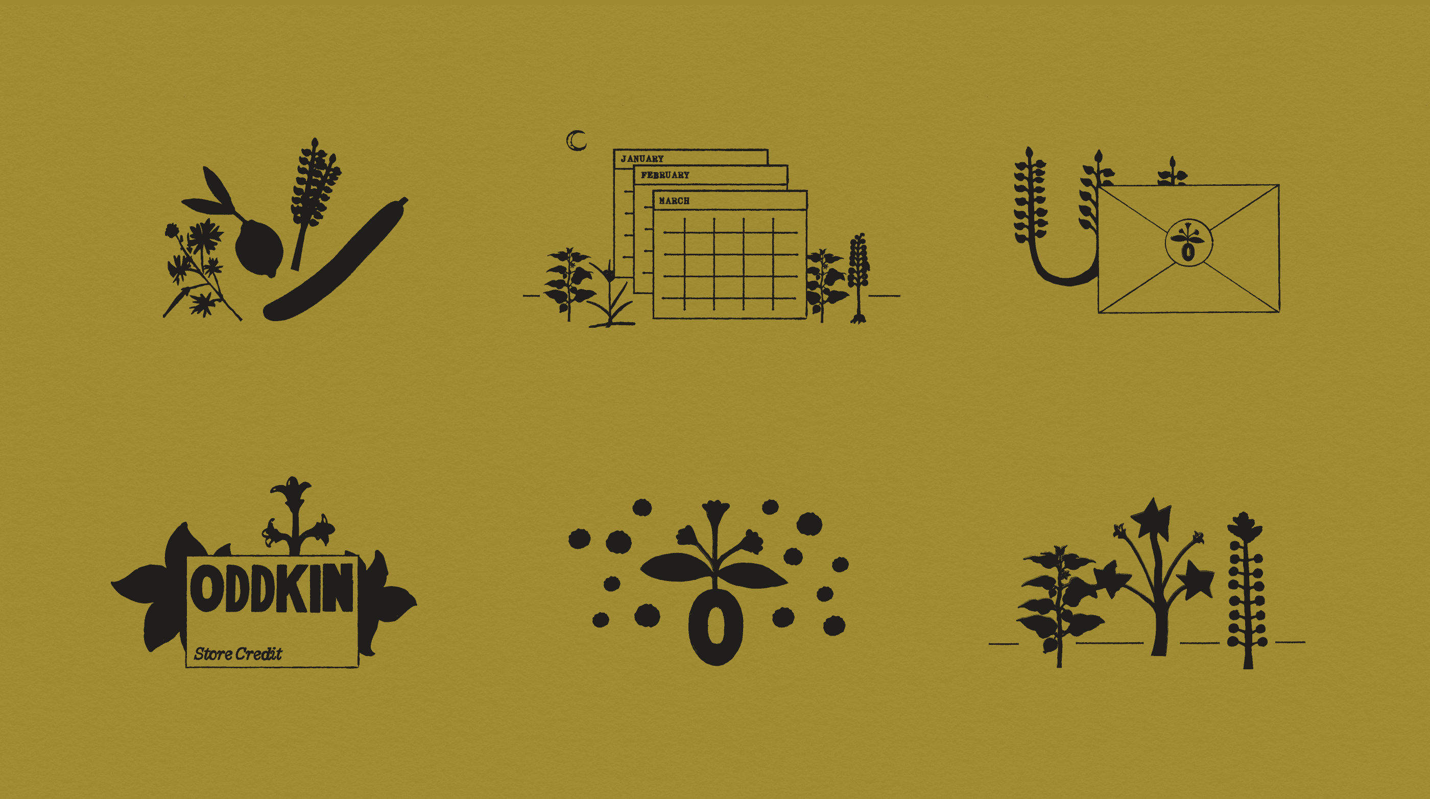 Oddkin's founder is Italian, and many of their products are sourced from Italy. They also host farm shares in Sicily, which are focused on foraging and living off the land. During our research phase, we stumbled upon the goldmine of archived Italian "Erbarios," or herb journals, which felt perfect for these themes. Because these are in the public domain, they are free to use. We then translated these illustrations into patterns whose organic charm worked well as illustrative elements for the brand.